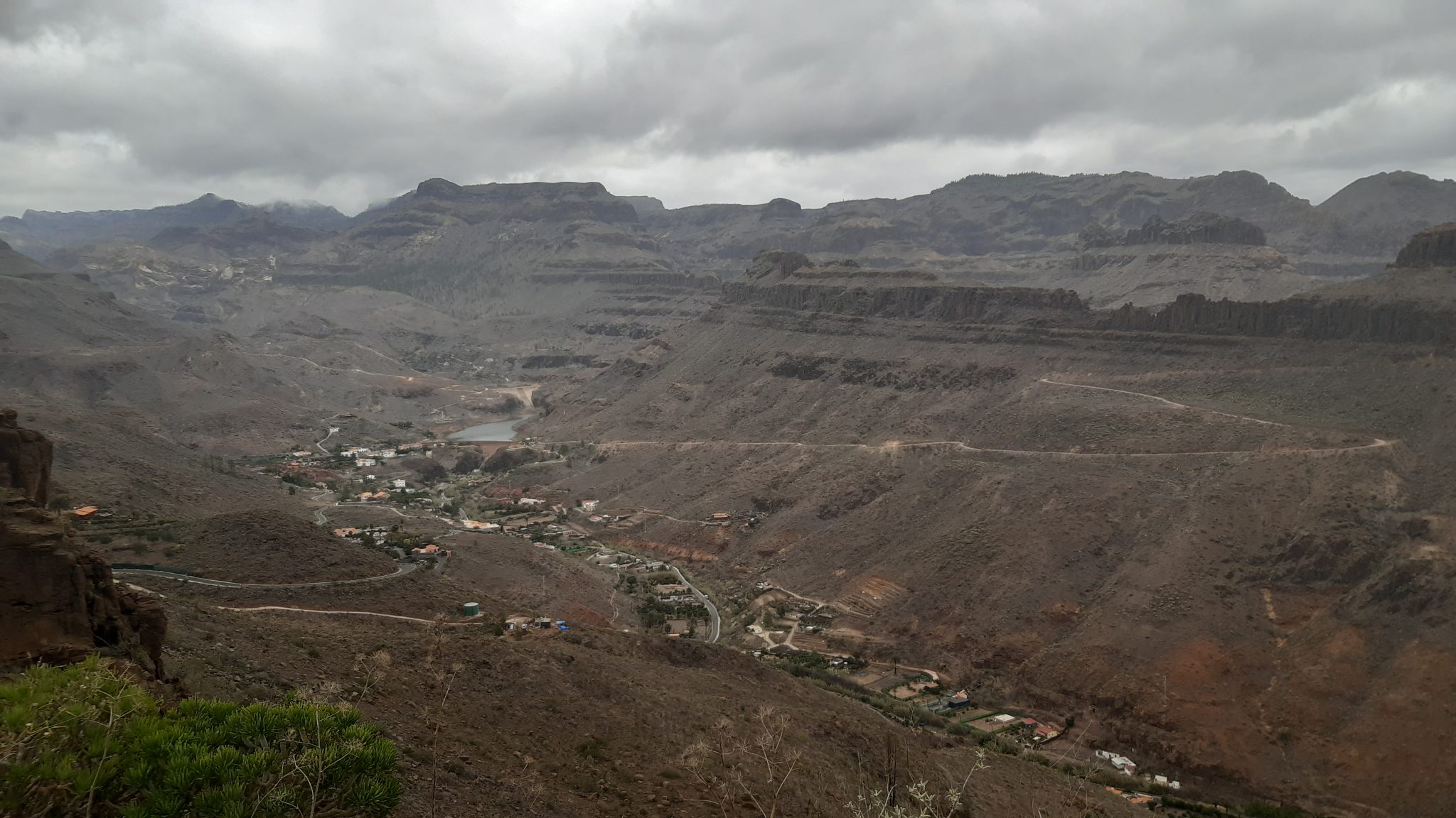 Van Montana la Data tot Ayagaures gaat de route berg op over een slingerende asfaltweg. Niet veel verkeer, na Monte Leon bijna alleen wielrenners. De omgeving is opeens verbluffend mooi, vergezichten, dorpjes tegen de heuvelruggen aan. Het landschap is ruiger dan op vorige eilanden. Op het hoogste punt zie ik Ayagaures in het diepe dal liggen. Ik kan 2 dingen doen: doorlopen en in Ayagaures taxi uit Maspalomas bellen of me omdraaien en berg af terug naar Montana la Data. Ik geniet nog even van het uitzicht en besluit tot het laatste.